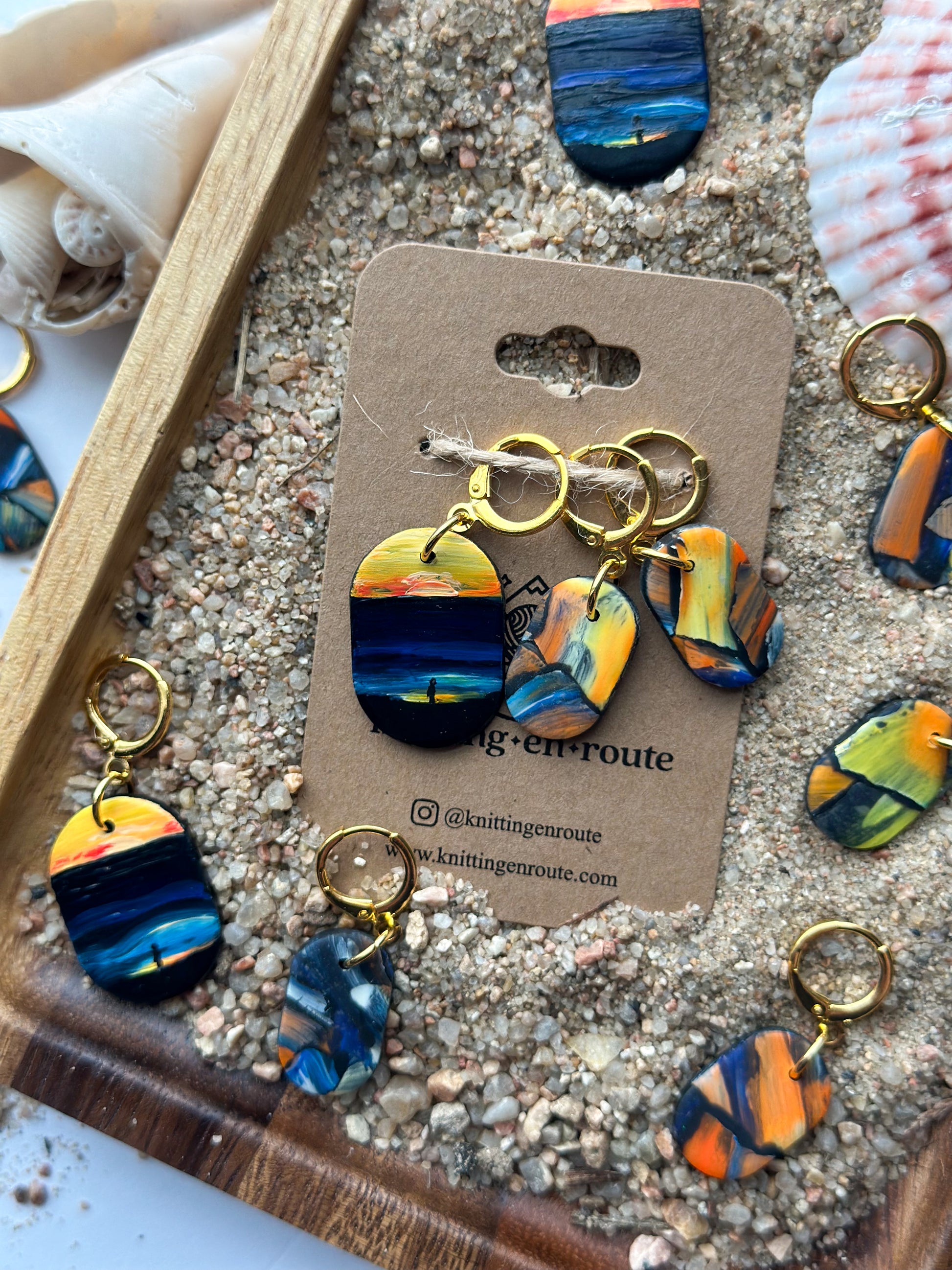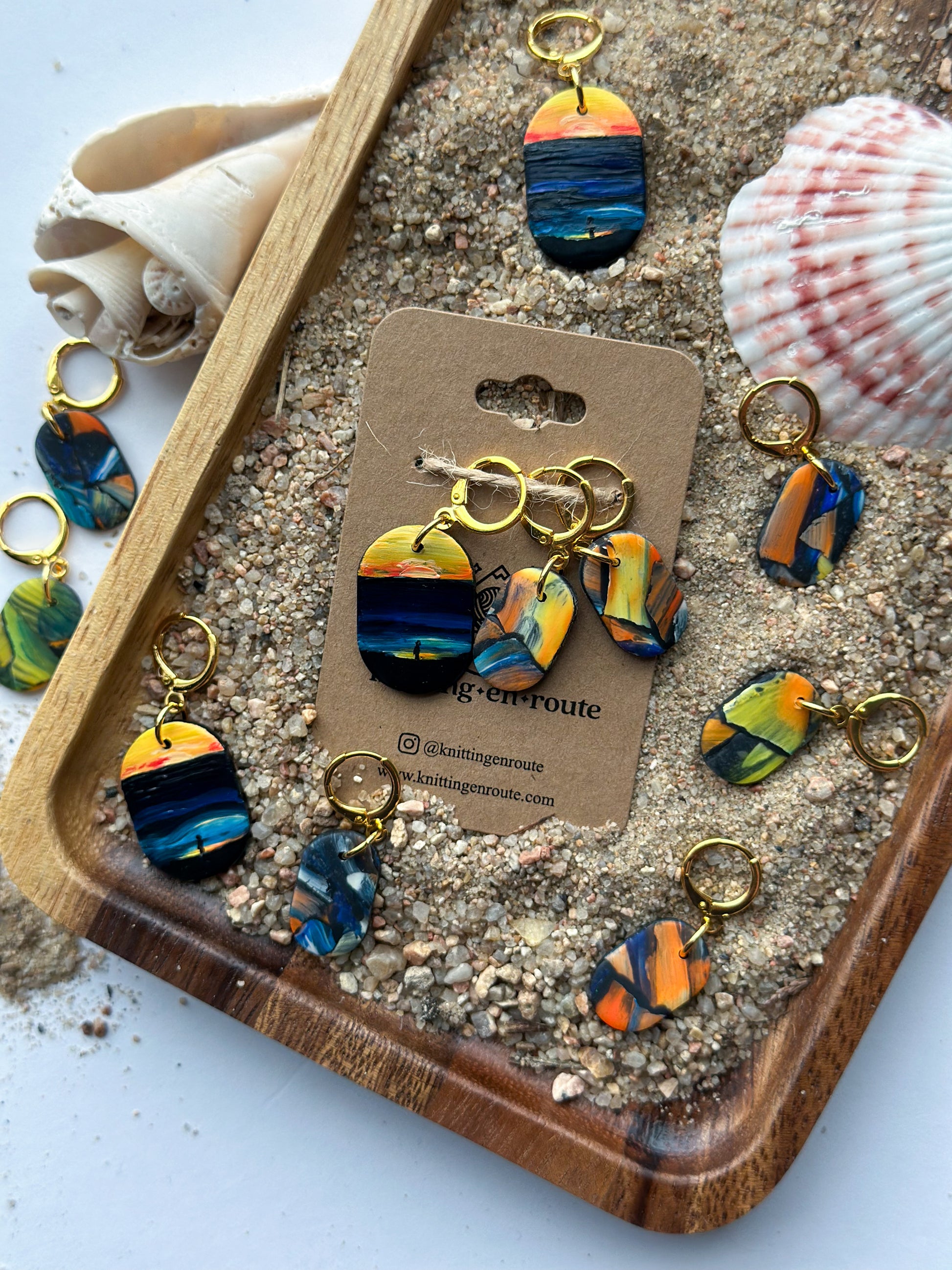 The main marker is hand painted on a black background and sealed with a glossy finish. The accents are as unique and varied as the colors of individual sunsets over water with mixes of yellow, orange, blue, and red. Please note this set varies more than others from marker to marker due to the nature of hand painting.Â