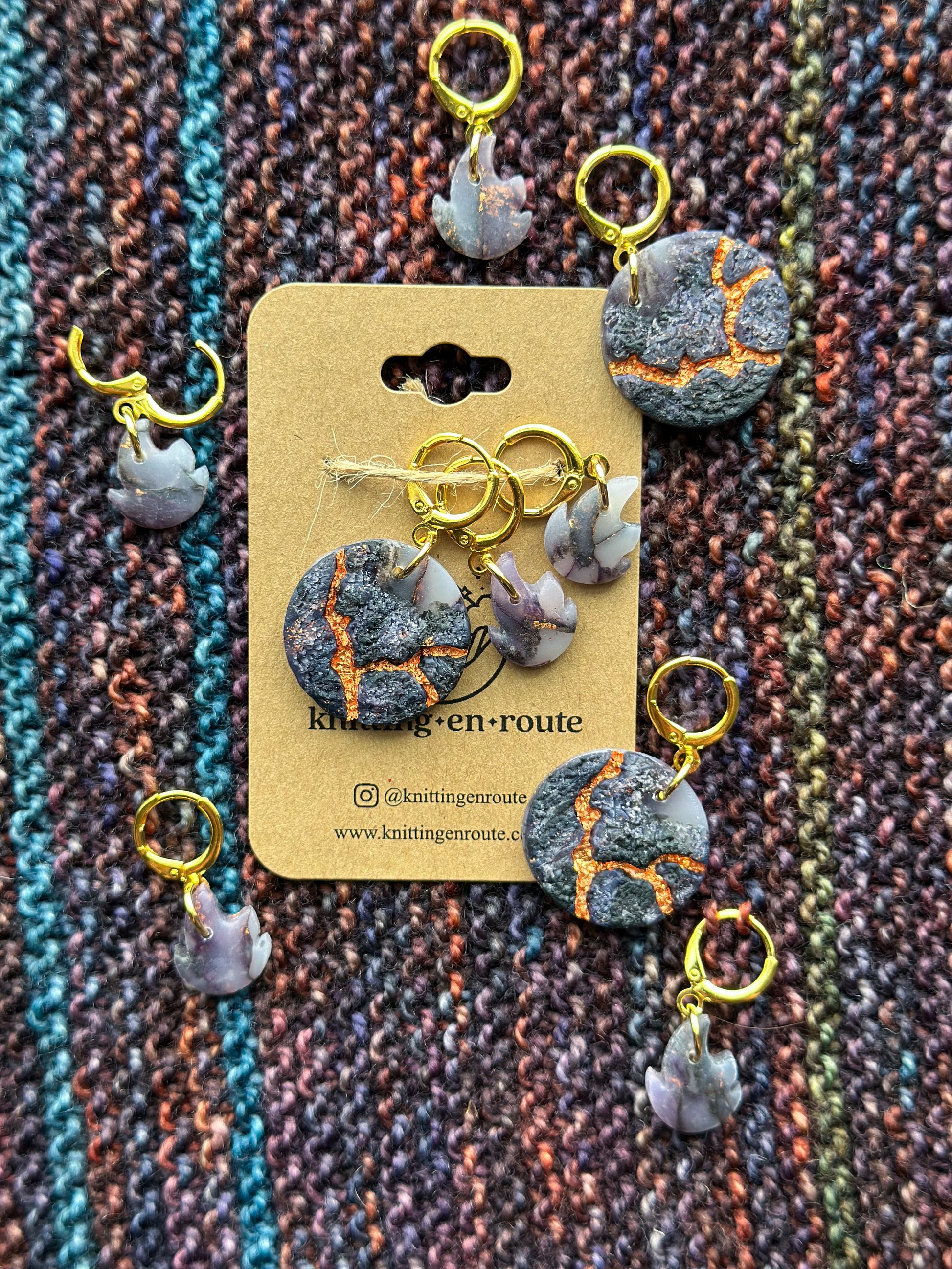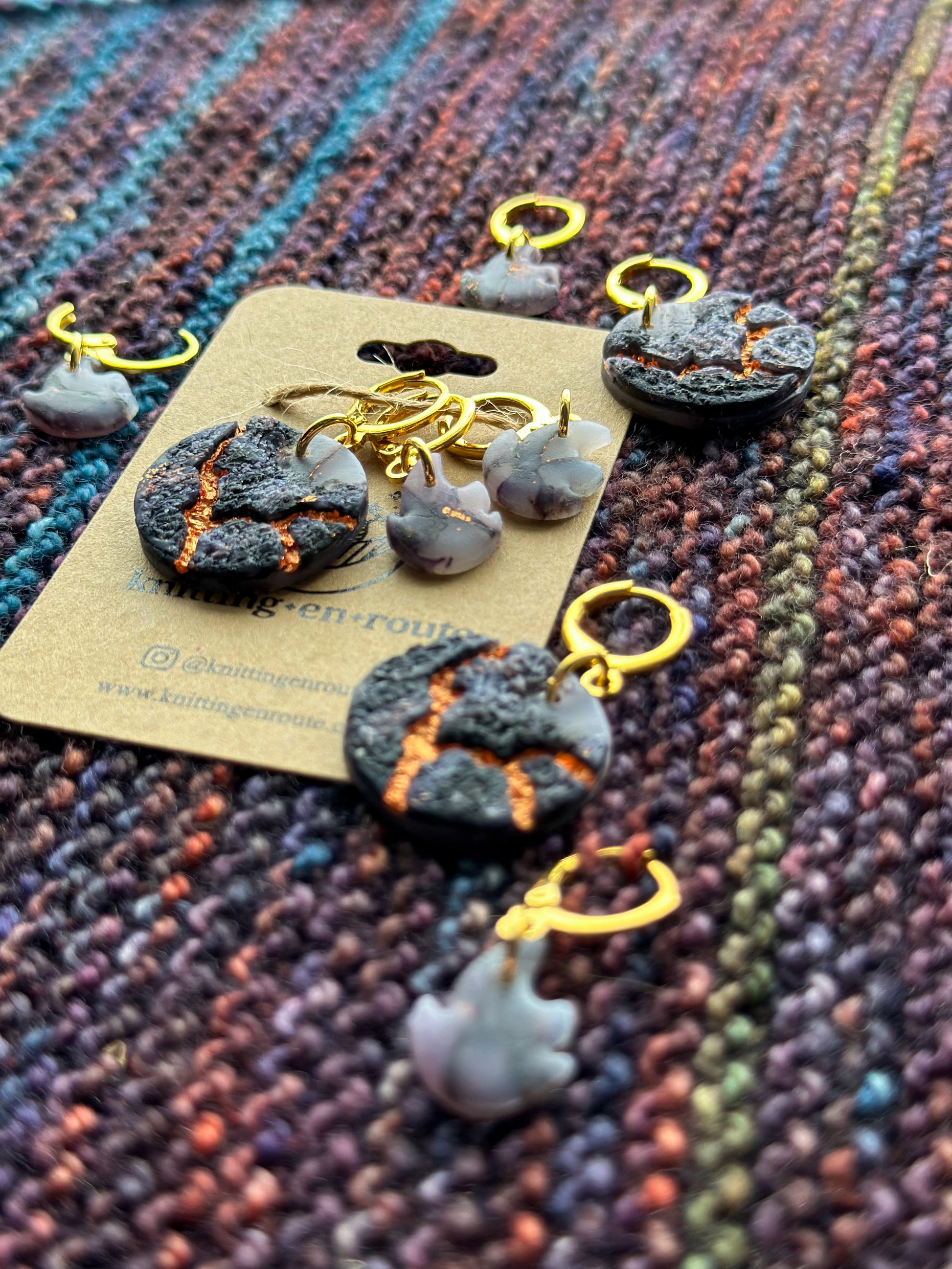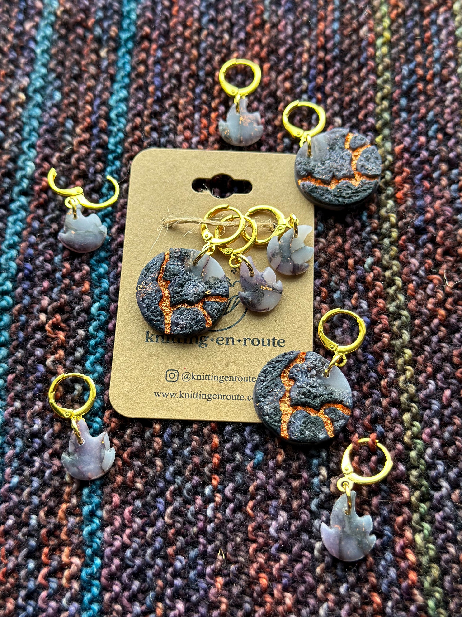 All markers come on 12mm gold lever back findings which are perfect for knitters and crocheters alike! The finding can act as both a closed circle to hang on a needle or hinge open to hook onto fabric.
