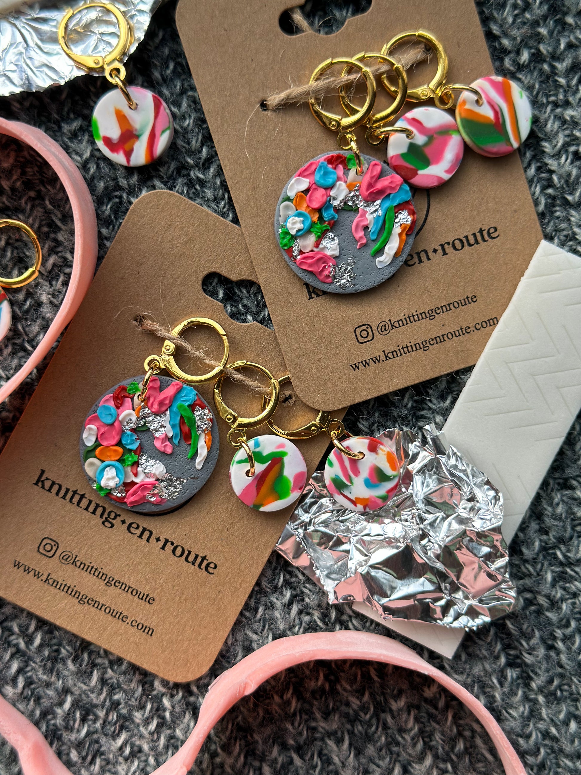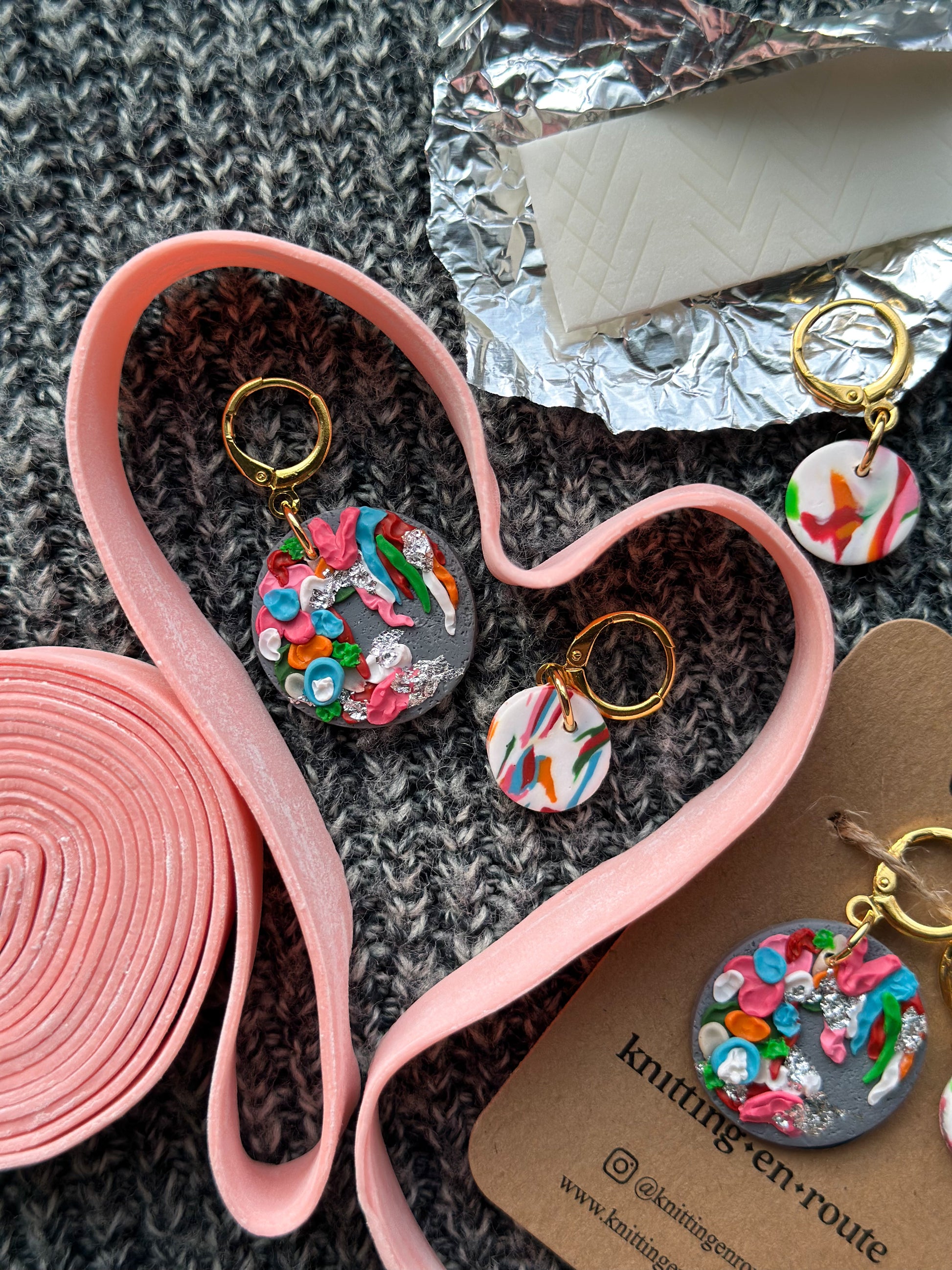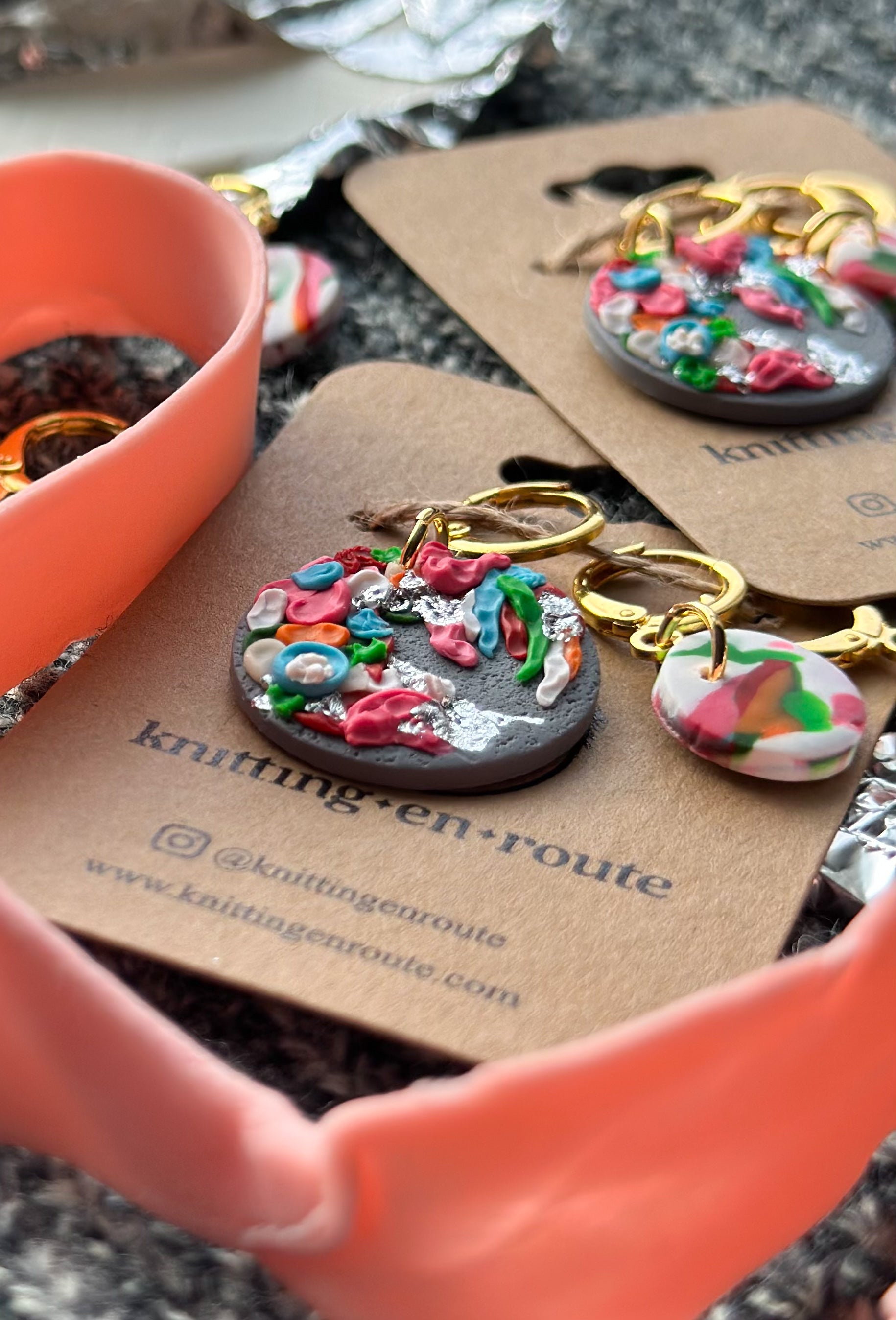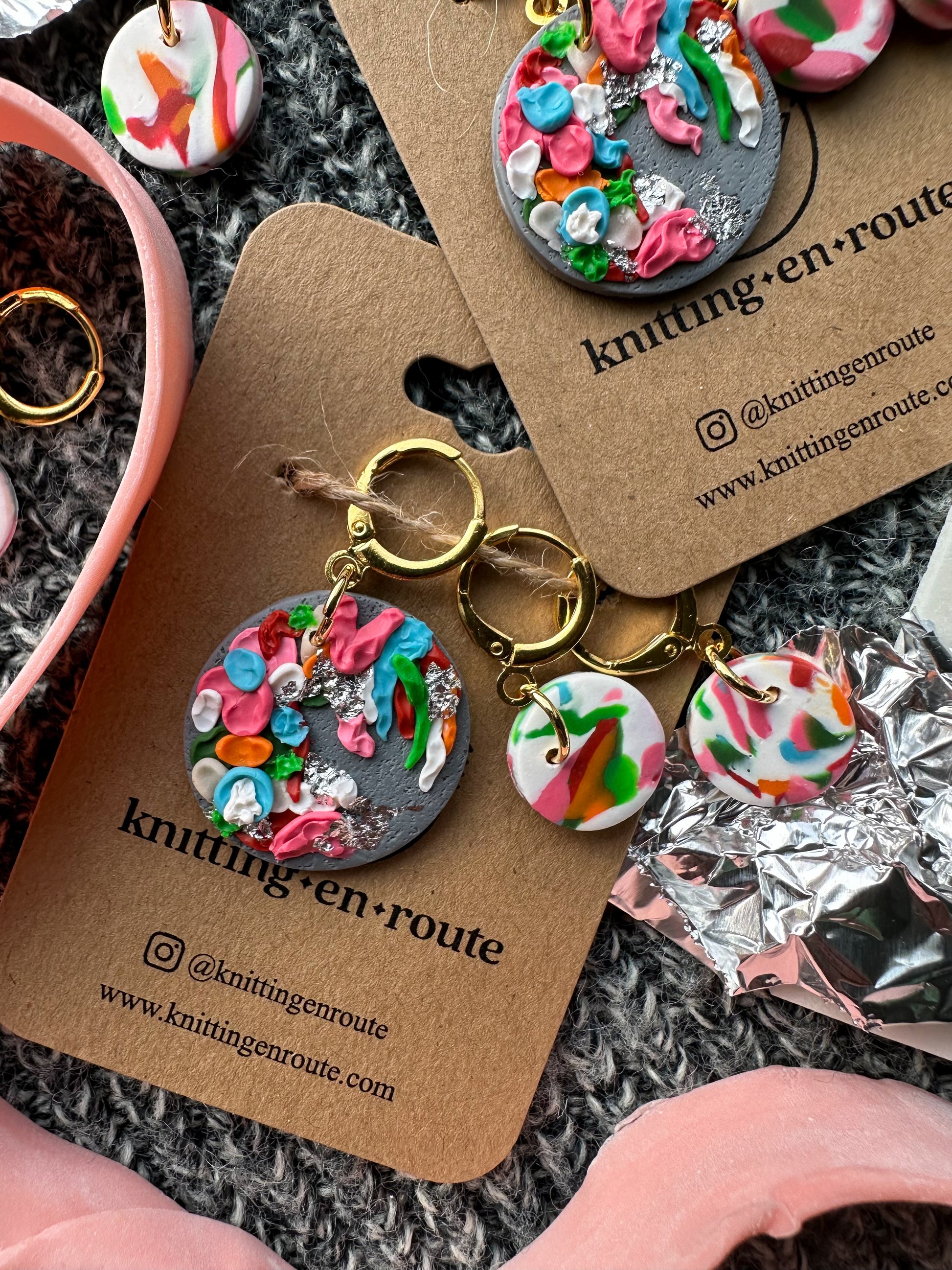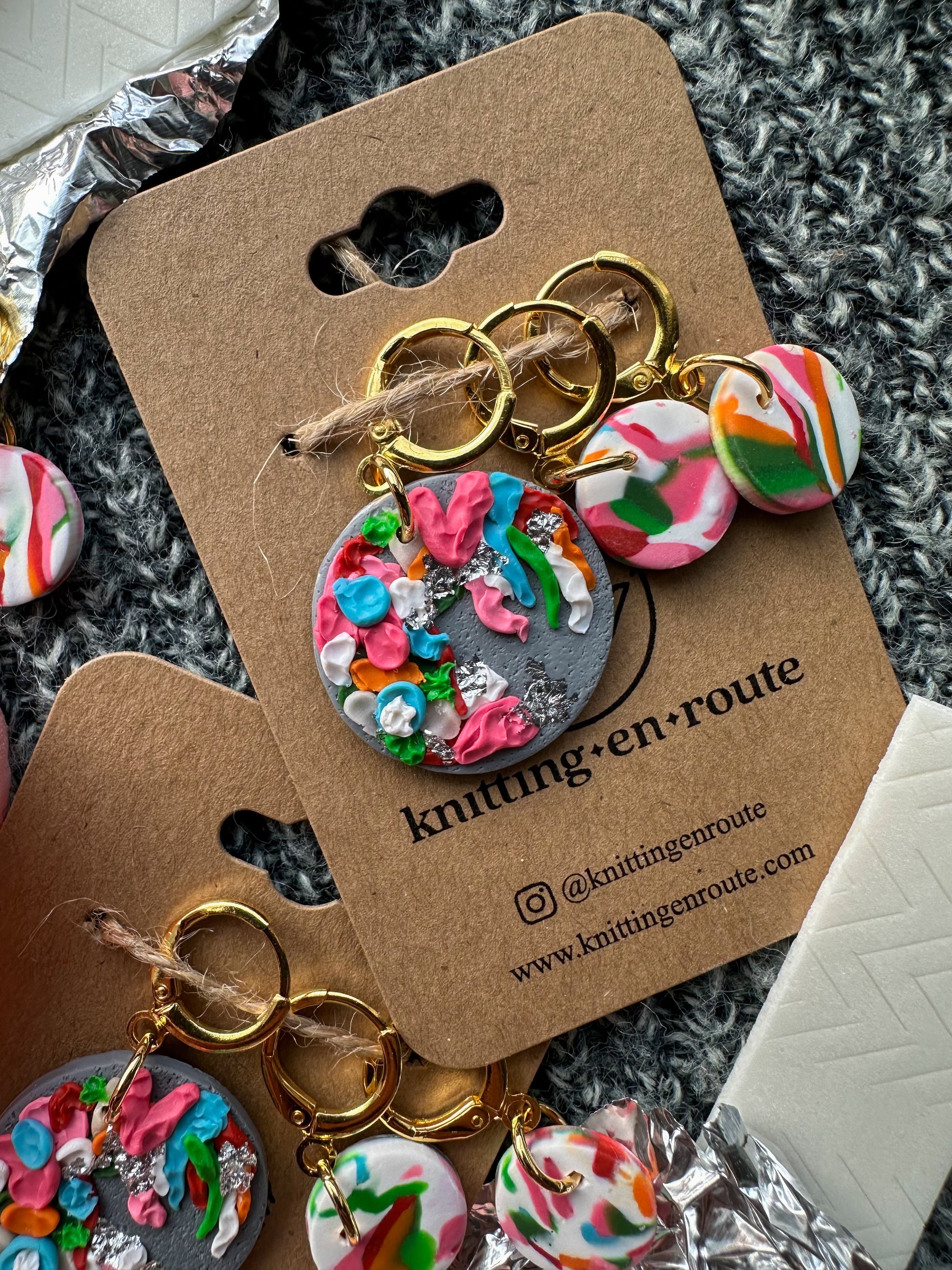Important Note & Care Instructions: All items are handmade. Slight variances (color, proportion, etc.) and imperfections are normal and to be expected from piece to piece. While polymer clay is durable and strong, it is best to store pieces carefully and away from direct sunlight. Avoid contact with chemicals, lotions, perfumes, and water. Under no circumstances should you attempt to bend your pieces as it could result in breakage. Strength tests are carried out by Knitting En Route LLC to ensure a proper cure. All findings should be treated with care as they are designed for light use.Â
